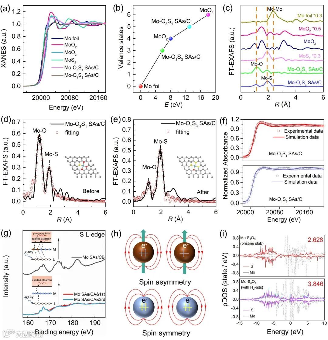 图3 Mo-O3S1 到 Mo-O1S3配位构型演变的结构分析。(a) Mo K边的XANES图,(b) XANES拟合得到的化合价图,(c) Mo在R空间的k3加权FT-EXAFS光谱, EXAFS在R空间的拟合曲线 (d) Mo SAs/CB,(e) Mo SAs/CA,(f) XANES近边拟合图,(g) S边的软XAS分析,(h) Mo SAs/CBs和Mo SAs/CA的电子自旋态图,(i) Mo-O3S1和H2/Mo-O1S3的pDOS-S图