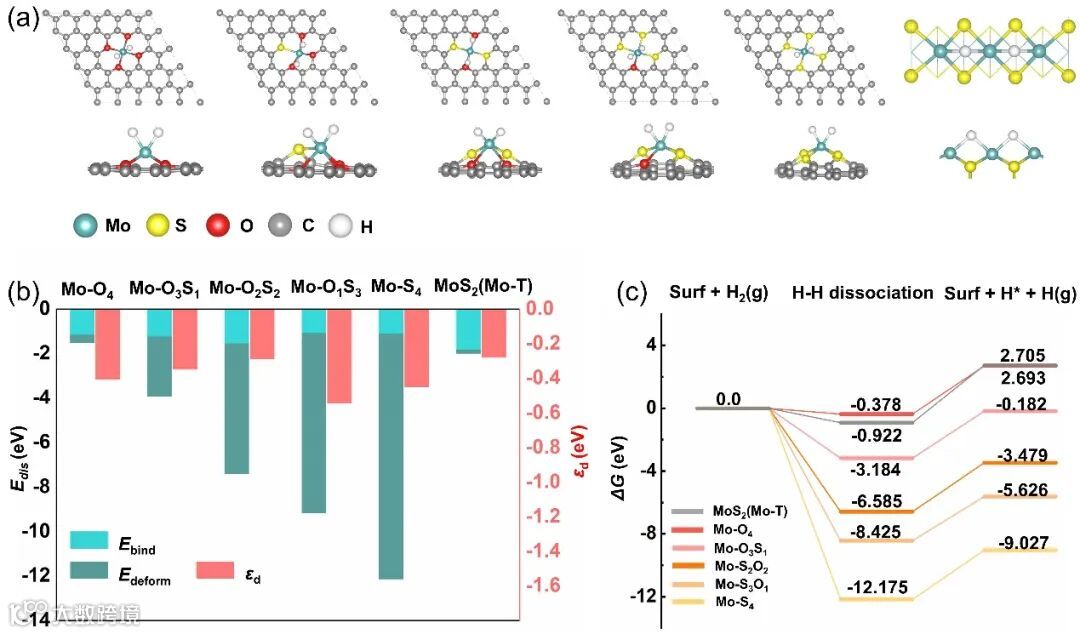 图1 单原子Mo催化剂对于H2活化的预测。(a) H2分别在Mo-O4, Mo-O3S1, Mo-O2S2, Mo-O1S3, Mo-S4 表面和MoS2 Mo边的解离吸附构型,(b) H2的解离吸附能 (ΔEads) 由Mo-H结合能 (Ebind) 和表面形变能 (Edef) 组成,(c) H2解离的吉布斯自由能和H自由基的分离能级图。