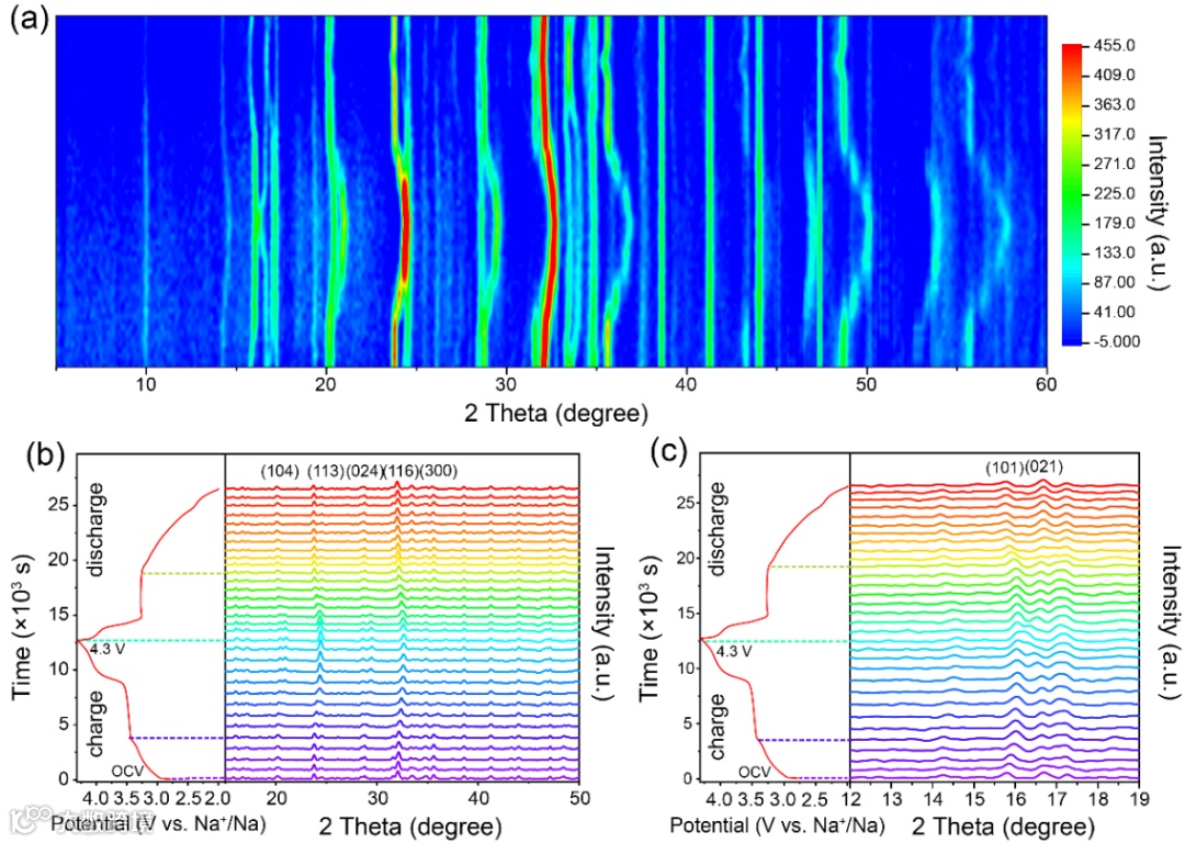 图5. NVFPP/C/G材料的充放电机理研究-原位XRD分析