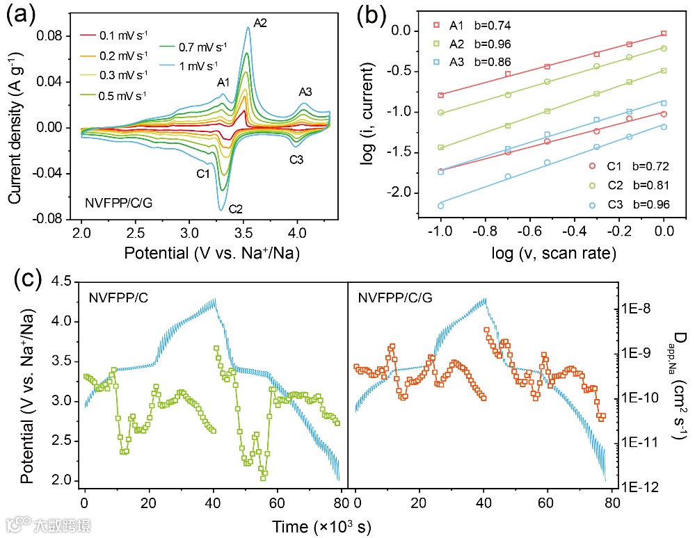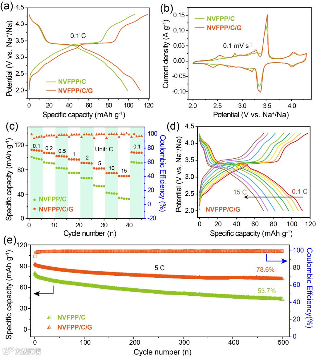 将所制备材料制成电极,与钠负极匹配组装钠离子电池,对其储钠性能进行了评估。结果显示,得益于共生结构和双碳层的协同效应,NVFPP/C/G表现出更优异的倍率性能和循环稳定性以及动力学特性。NVFPP/C/G材料在0.1C下表现出113.1 mA h g-1的比容量,即使在15C的高倍率下,也表现出70.4 mA h g-1的比容量。主要是由于其独特的结构,特别是在高扫描速率下,NVFPP/C/G电极是赝电容和扩散贡献共存的,有利于其优异高倍率性能的获得。