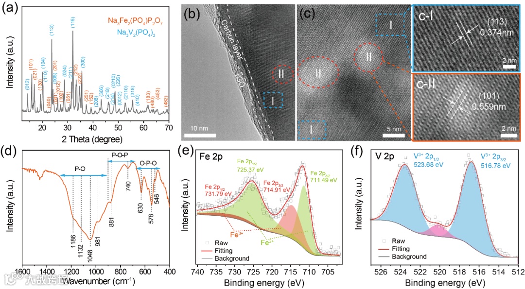 通过HR-TEM进一步解释了该材料的结构特征,在图1b和1c中,该区域表现出明显不同的晶格条纹特征,为0.374和0.559 nm,分别对应于Na3V2(PO4)3相的(113)面和Na3Fe2(PO4)(P2O7) 相的(101)面,进一步表明成功制备了聚阴离子型异质复合材料。