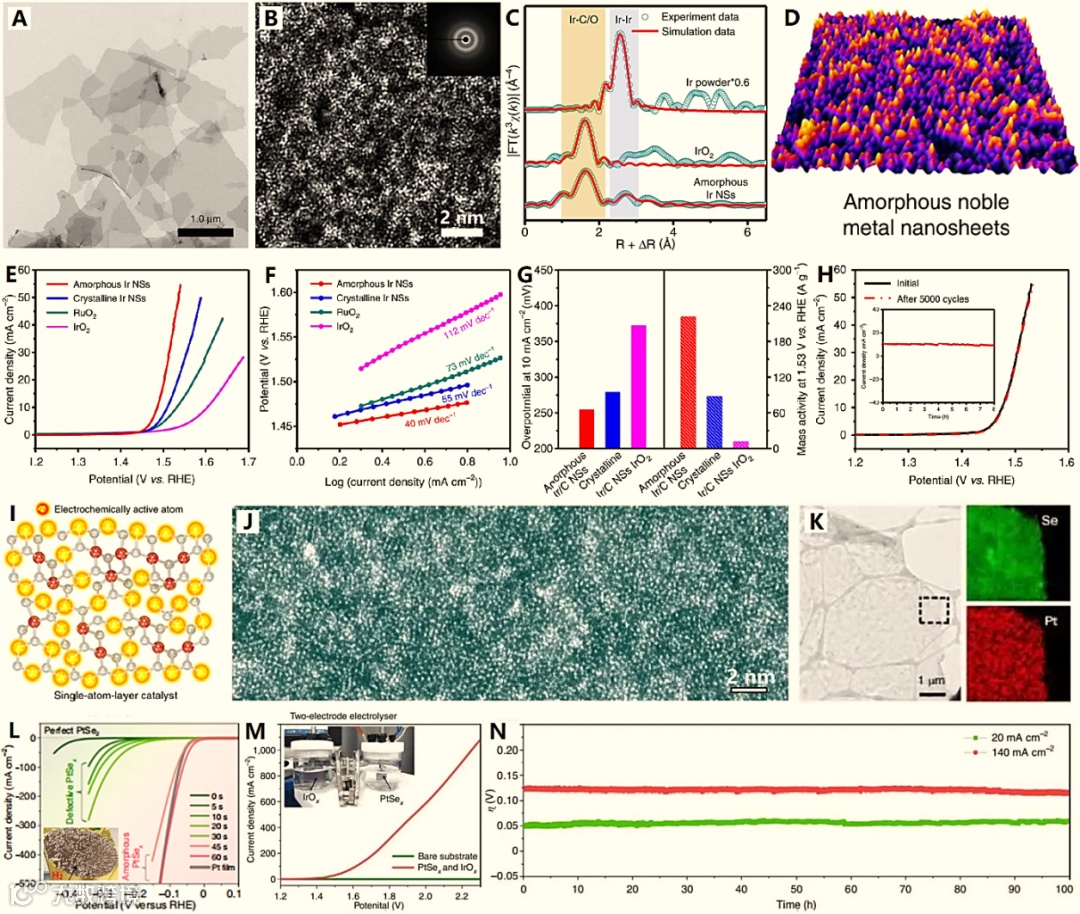图2 二维(2-D)AMUNMs: (A-H) Ir基AMUNMs纳米片和(I-N) PtSex基AMUNMs纳米片的结构表征和催化性能。