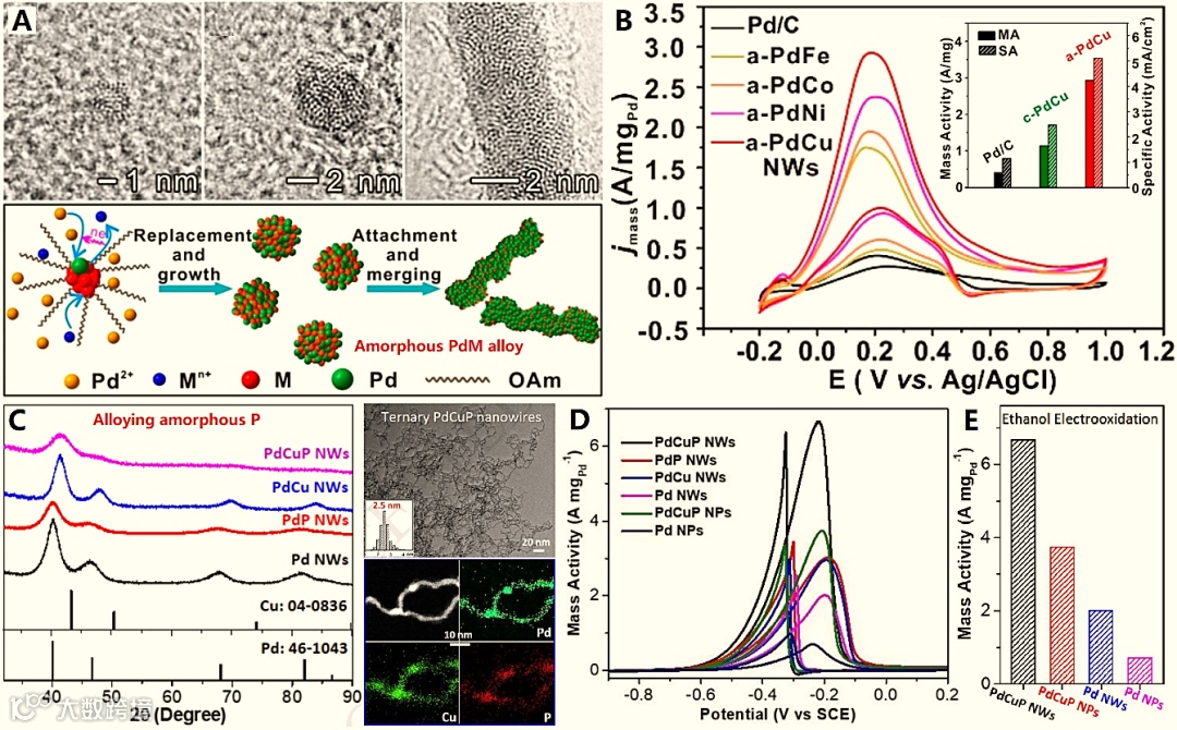 图3 一维(1-D)AMUNMs: (A-B) PdM AMUNMs纳米线和(C-E) PdCuP AMUNMs纳米线的结构表征和催化性能。