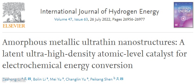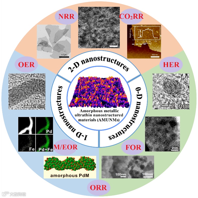 新型的非晶金属超薄纳米结构材料(AMUNMs)可以被视为一种潜在的超高密度原子级催化剂(UHD ALCs)独立体系(包括0-D、1-D和2-D超薄纳米结构),可用于广泛的电化学转化应用。超薄的纳米结构(单原子层或少原子层厚度)、远距离无序排列的原子结构(大量空位和微孔)和丰富的金属-非金属配位结构(超高密度配位原子结构)使AMUNMs具有较高的金属原子利用率、高的电催化效率和令人满意的稳定性。