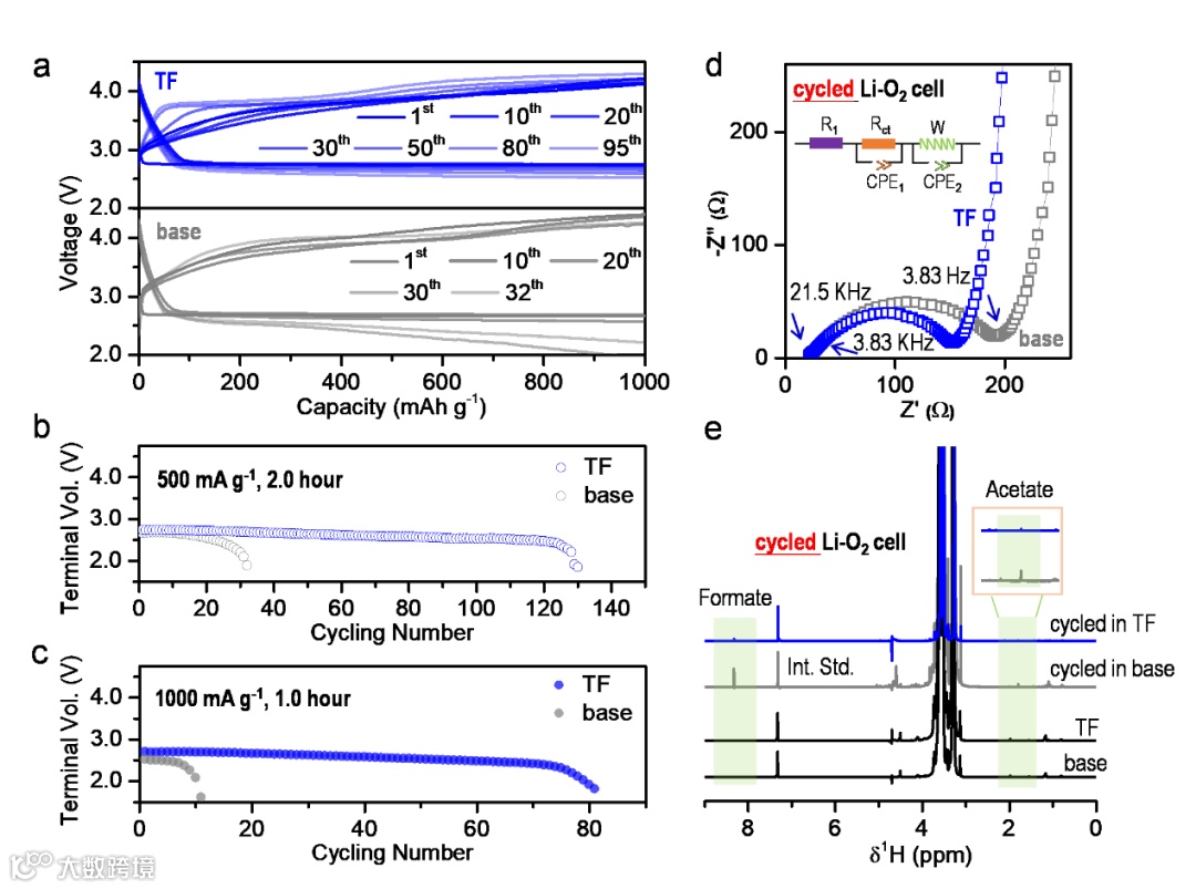 图5 (a)有无PTFEMA添加剂时,Li-O2电池充放电曲线。电流密度分别为(b)500 mA g-1和(c)1000 mA g-1条件下,有无PTFEMA添加剂的Li-O2电池循环性能对比。循环20圈后,Li-O2电池的(d)阻抗谱和(e)核磁共振1H谱。