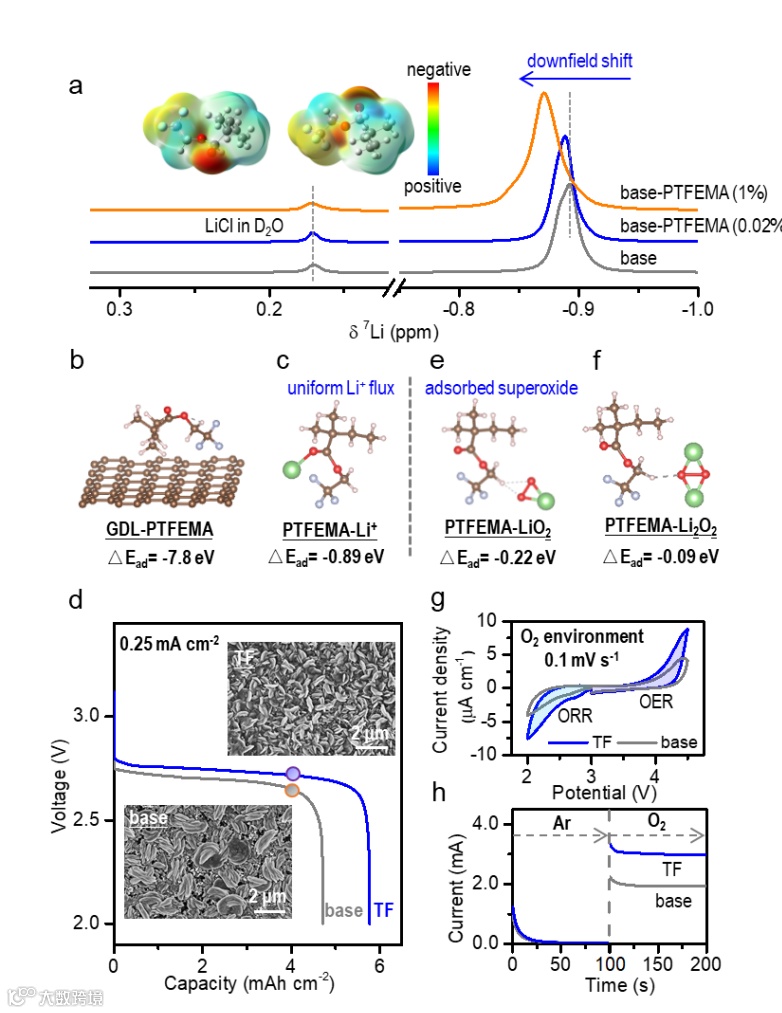 图3 (a)电极液中不同含量的PTFEMA对应的核磁共振7Li谱。(b)GDL-PTFEMA与(c)PTFEMA-Li+的结构优化以及吸附能计算。(d)有无PTFEMA添加剂时,Li-O2电池的深度放电曲线。插图:容量为4.0 mAh cm-2时,Li-O2电池的放电产物形貌。(e)PTFEMA-LiO2与(f)PTFEMA-Li2O2的结构优化以及吸附能计算。(g)O2条件下,有无PTFEMA添加剂的循环伏安曲线。(h)固定电位(2.2 V vs. Li+/Li)下,转换气氛(惰性Ar,O2)时电流随时间的响应(i-t曲线)。