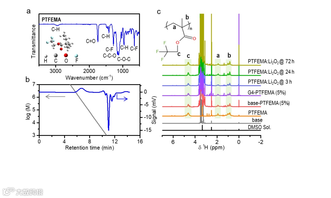 图2 PTFEMA的(a)红外与(b)分子凝胶色谱表征。(c)溶于电解液的PTFEMA及其对过氧化锂稳定性的核磁共振1H谱测试。