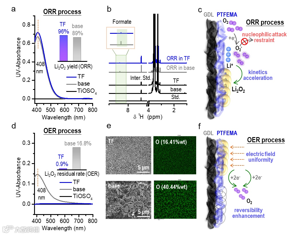 图4 (a)ORR过程硫酸氧钛基紫外滴定。(b)基于重水萃取的核磁共振1H谱。在进行合理分析前已对内标苯的峰高度进行了归一化。(c)含PTFEMA添加剂的Li-O2电池ORR过程机理示意图。(d)OER过程硫酸氧钛基紫外滴定。(e)充电容量为4.0 mAh时,电极表面的扫描电镜和能谱分析。(f)含PTFEMA添加剂的Li-O2电池OER过程机理示意图。