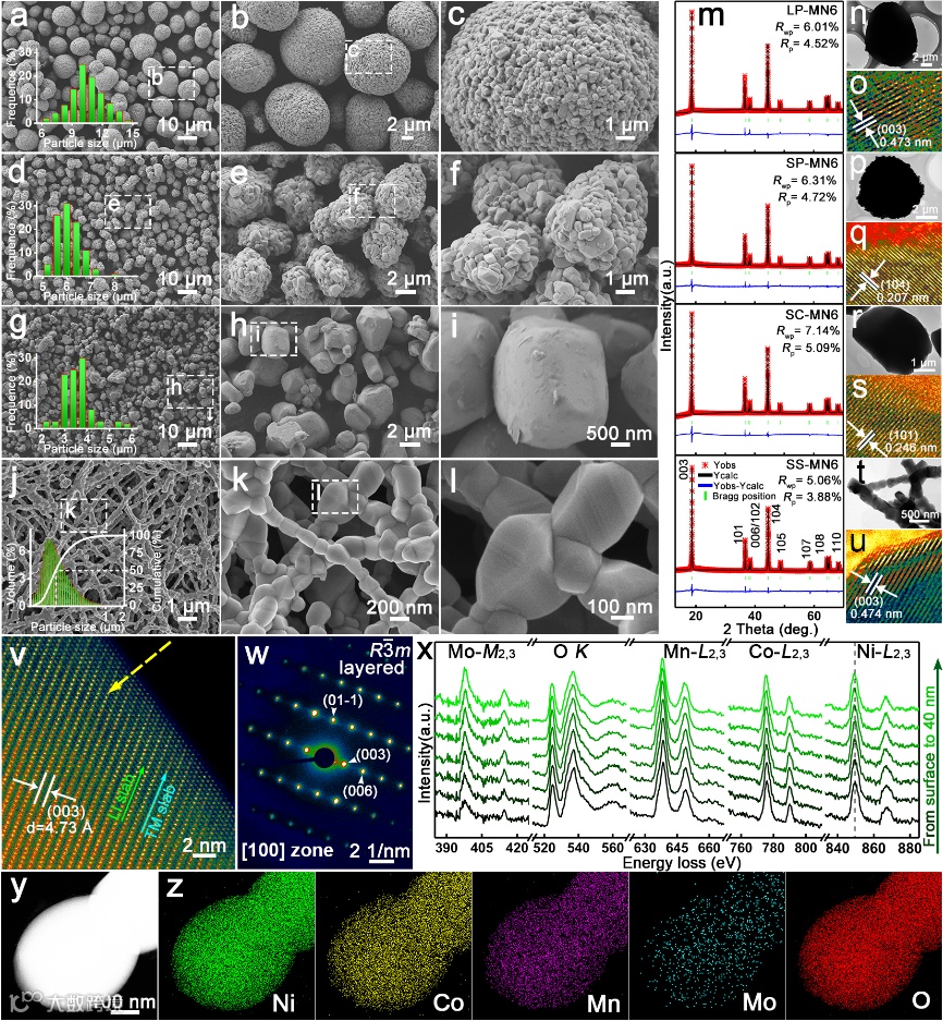 本工作提出了亚微米单晶结构设计和杂原子掺杂协同策略,构建在高电压(≥4.5 V)下稳定运行且机械化学性能可靠的亚微米级小单晶型Mo6+掺杂LiNi0.6Co0.2Mn0.2O2 (SS-MN6),并与常规多晶型和常规微米级单晶型LiNi0.6Co0.2Mn0.2O2 材料进行了对比研究。