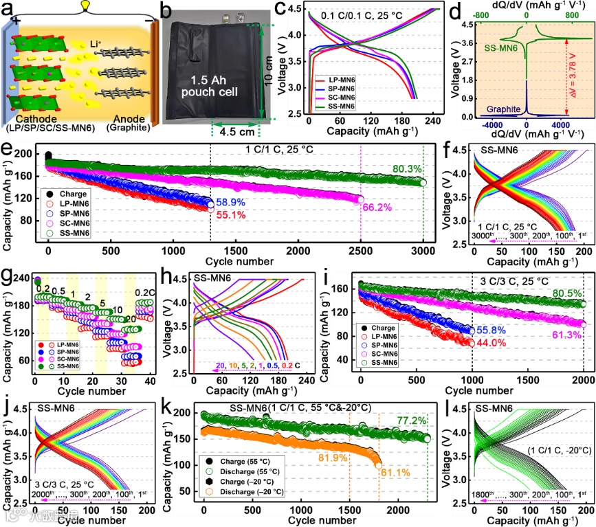 得益于其结构上优异的力学稳定性,基于SS-MN6正极材料组装成的袋式软包全电池展现出极其优异的高压(4.5 V)循环稳定性和耐环境温度(−20 − 55 °C)能力。其在2.8−4.5 V电压区间:1 C/1 C,25 °C循环3000次容量保持率为80.3%;3 C/3 C,25 °C循环2000次容量保持率为80.5%;1 C/1 C,55 °C循环2300次容量保持率为77.2%。本文的贡献可为构建具有优异机械化学稳定性的先进正极材料提供新思路。