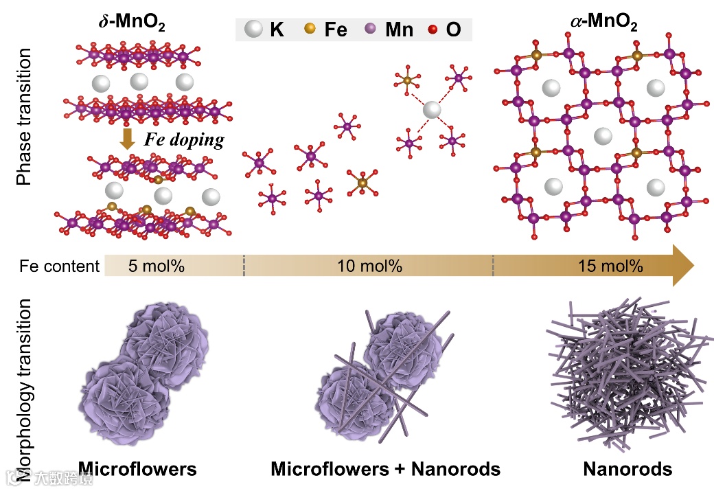 图2. MnO2随着 Fe 掺杂量增加的相变和形貌转变示意图。