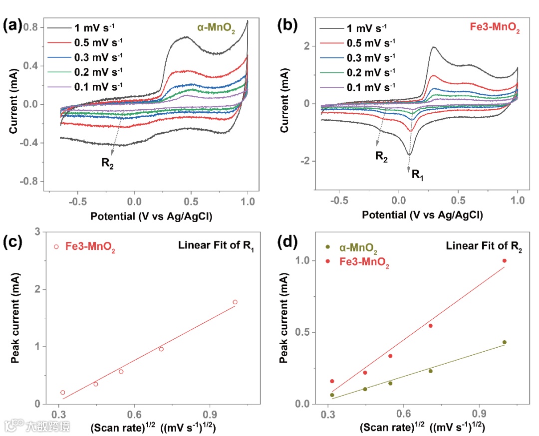 图4. (a-b) 未掺杂的 α-MnO2和 Fe3-MnO2的 CV 曲线,(c-d) R1 和 R2 的阴极峰电流与扫描速率平方根的线性拟合。