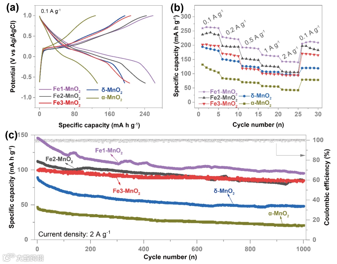 对比不同MnO2电极的电化学性能发现,在0.1 A g−1的电流密度下,对于δ-MnO2晶型,比容量从未掺杂时的194.4 mA h g−1提升至掺杂后(Fe1-MnO2)的263.5 mA h g−1;对于α-MnO2晶型,比容量从未掺杂时的131.9 mA h g−1 提升至掺杂后(Fe3-MnO2)的205.9 mA h g−1。