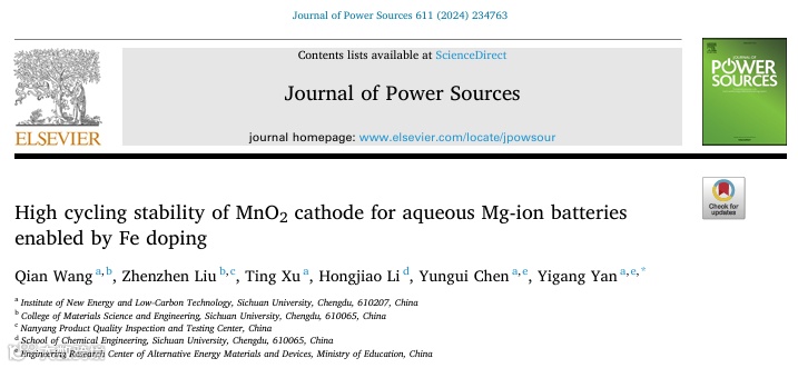 近日,来自四川大学的严义刚研究员,在国际期刊Journal of Power Sources上发表题为“High cycling stability of MnO2 cathode for aqueous Mg-ion batteries enabled by Fe doping”的研究文章。该文章分析了Fe掺杂对水系镁离子电池中MnO2正极循环稳定性的改善作用,并通过理论计算模拟了Fe掺杂MnO2增强离子迁移的机制。