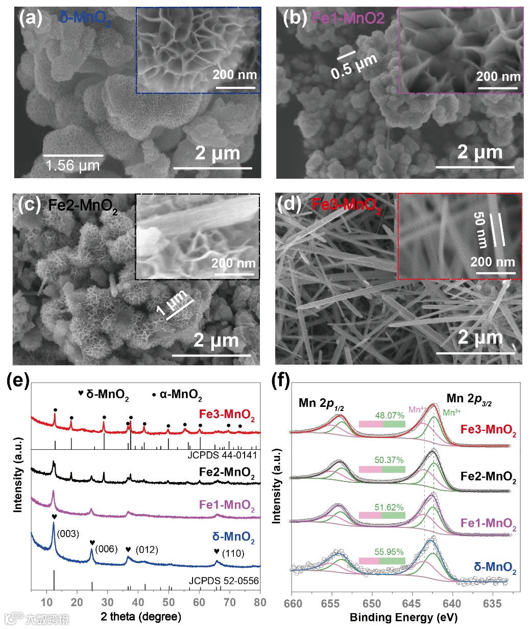 图1. (a-d) 未掺杂的 δ-MnO2和 Fe-MnO2的 SEM 图像,(e) XRD 图谱和 (f) Mn 2p XPS 光谱。