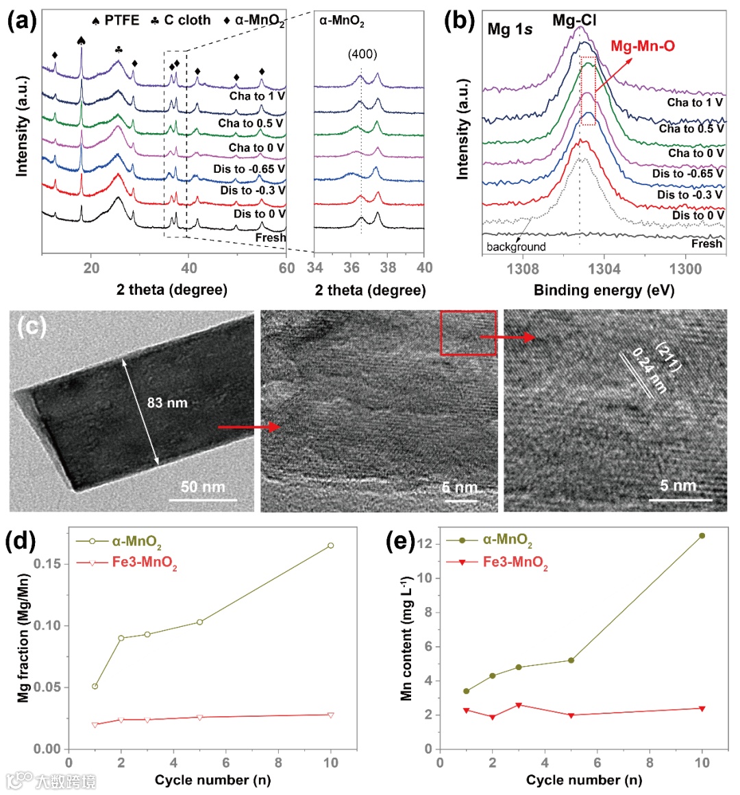 图6. (a) 不同状态下 Fe3-MnO2电极的原位 XRD 图谱,(b) 不同状态下 Fe3-MnO2电极的 Mg 1s XPS 光谱,(c) Fe3-MnO2在经过1000次充放电循环后的 TEM 图像,(d) 未掺杂的 α-MnO2和 Fe3-MnO2电极在完全充电状态下经过不同充放电循环后的 Mg/Mn 原子比,(e) 未掺杂的 α-MnO2和 Fe3-MnO2电极在 0.1 A g−1 下前 10 次循环过程中 1 M MgCl2 水溶液电解质中溶解的 Mn 元素分析。