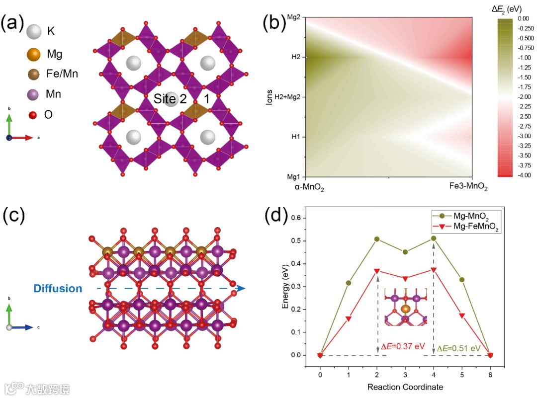 利用CV曲线研究电极的电化学特性(图4)以及理论计算模拟离子迁移(图5)论证了Fe掺杂后,α-MnO2由单一镁离子导体转变为双离子导体,增加了质子传导,这是材料比容量增加的主要原因。