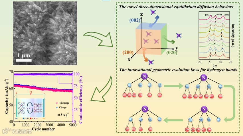 基于此,来自长沙大学的陈晗教授与湖南工业大学的张昌凡教授合作,在国际知名期刊Chemical Engineering Journal上发表题为“High-performance monoclinic WO3 nanospheres with the novel NH4+ diffusion behaviors for aqueous ammonium-ion batteries”的研究成果。该研究成果重点关注了单斜相WO3纳米球用作水系铵离子电池负极,系统地研究了WO3纳米球的形成机制及相转变机制,并创新性地揭示了电化学过程中NH4+离子别具一格的扩散行为及几何氢键的演化过程。
