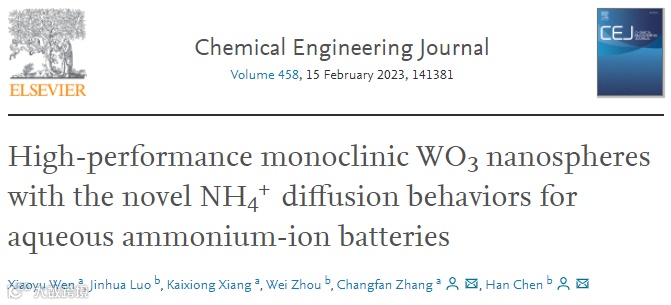 Xiaoyu Wen, Jinhua Luo, Kaixiong Xiang, Wei Zhou, Changfan Zhang*, Han Chen*, High-performance monoclinic WO3 nanospheres with the novel NH4+ diffusion behaviors for aqueous ammonium-ion batteries. Chem. Eng. J., (2023) 141381