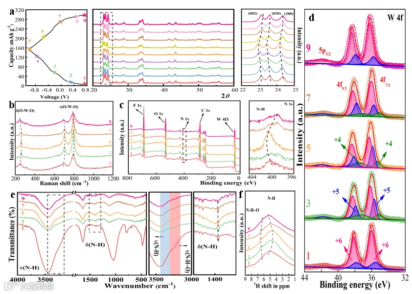 图4.(a)电流密度为0.1 A g-1时的充放电曲线及各状态点的非原位XRD图;(b)非原位拉曼图谱;(c-d)非原位XPS图谱;(e)非原位FTIR图谱及(f)非原位核磁共振氢谱