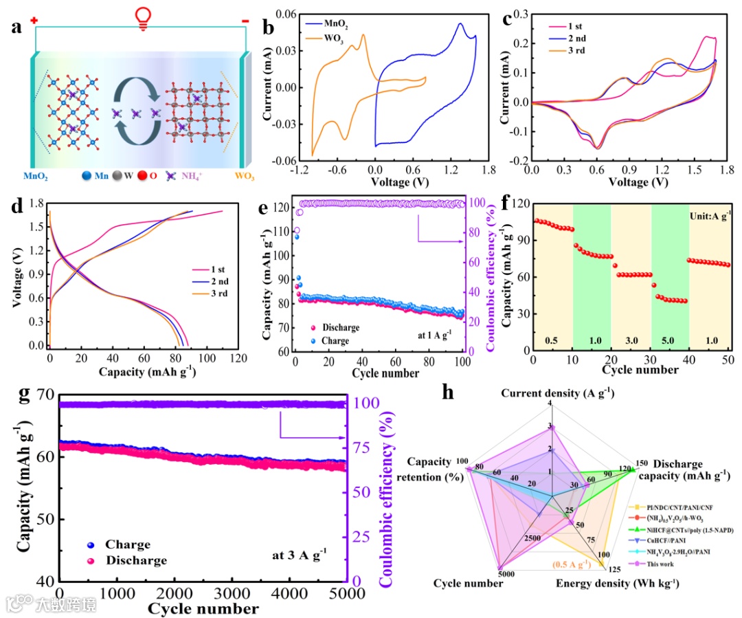 图6.(a)γ-MnO2//WO3水系铵离子全电池的示意图;(b)正负极的循环伏安曲线;(c)γ-MnO2//WO3水系铵离子全电池前三次的循环伏安曲线;在1.0 A g-1的电流密度下,γ-MnO2//WO3水系铵离子全电池(d)前三次的充放电曲线及(e)循环性能;(f)γ-MnO2//WO3水系铵离子全电池的倍率性能;(g)γ-MnO2//WO3水系铵离子全电池在3.0 A g-1的电流密度下的长循环性能及(h)γ-MnO2//WO3水系铵离子全电池电化学性能的横向对比。