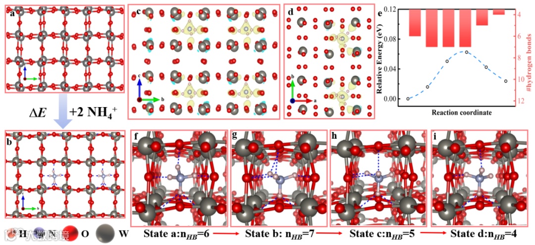 图5.(a, b)NH4+离子嵌入单斜相WO3框架前后的最低能量模型;(c, d)电荷密度分布图;(e)NH4+离子在单斜相WO3晶格中的扩散路径及相应的扩散活化能;(f-i)NH4+离子扩散过程中氢键的演变过程。