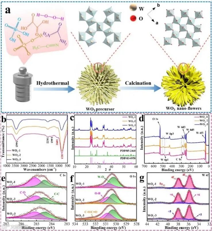 图1.(a)单斜相WO3的合成工艺示意图;WO3-x (x=1, 2, 3)样品的结构表征:(b)FTIR图谱;(c)XRD图谱;(d)XPS总谱;(e)C 1s高分辨XPS谱;(f)O 1s高分辨XPS谱及(g)W 4f高分辨XPS谱。