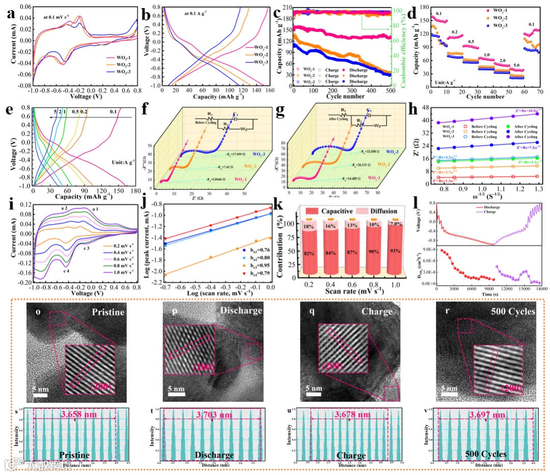 图3.(a)WO3-x (x=1, 2, 3)电极的循环伏安曲线;(b)WO3-x (x=1, 2, 3)电极在0.1 A g-1的电流密度下的首次充放电曲线;(c)WO3-x (x=1, 2, 3)电极在0.1 A g-1的电流密度下的循环性能;(d)WO3-x (x=1, 2, 3)电极的倍率性能;(e)不同电流密度下WO3-1电极的充放电曲线;(f)WO3-x (x=1, 2, 3)电极循环前的Nyquist图;(g)WO3-x (x=1, 2, 3)电极经过500次循环后的Nyquist图;(h)低频区Z′与𝜔–1/2的相互关系;(i)WO3-1电极在不同扫描速度下的循环伏安曲线;(j)i图中峰电流和扫描速度之间的对数关系;(k)WO3-1电极在不同扫描速度下的赝电容贡献率;(l)GITT曲线及相应的NH4+离子扩散系数;充放电过程中WO3-1电极(200)晶面的HAADF-STEM图:(o)原始;(p)放完;(q)充满;(r)500次循环后及(s-v)相应的强度分布。