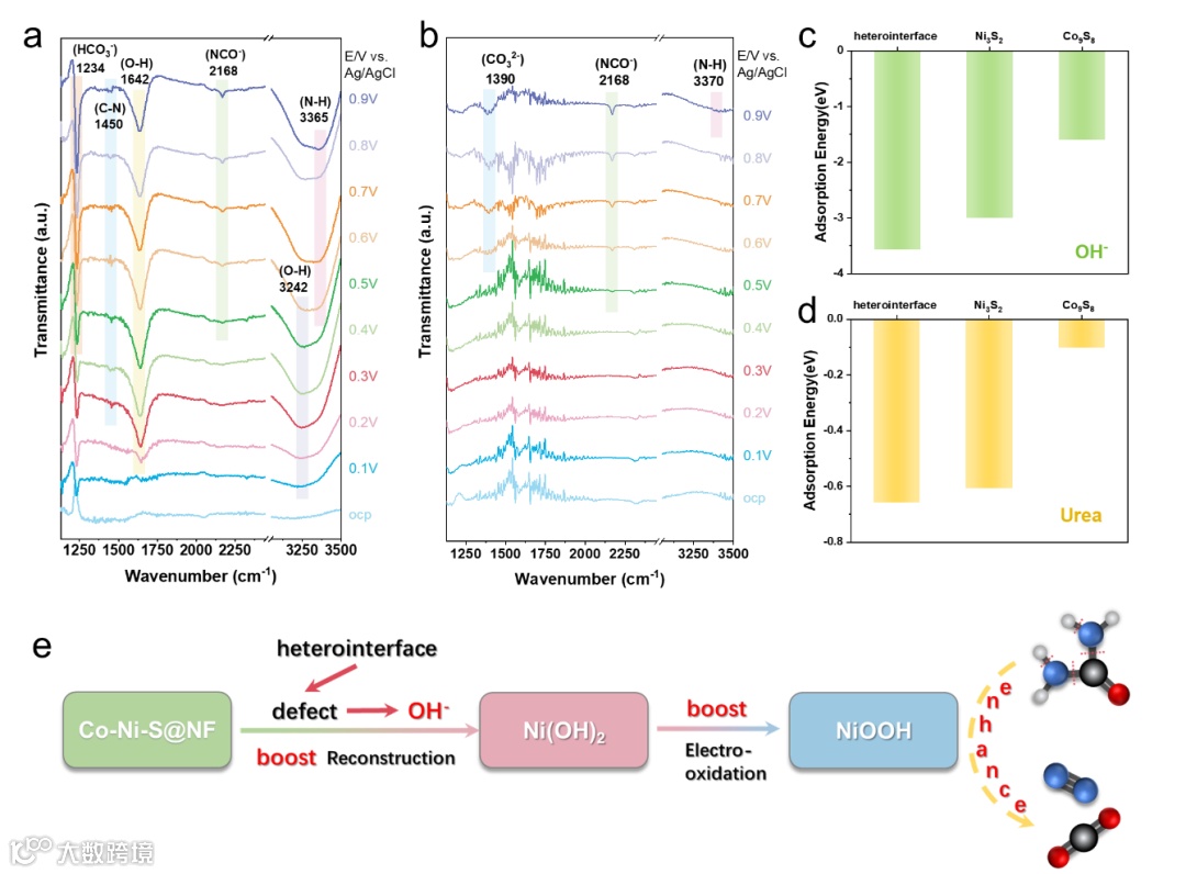 采用电化学原位红外技术对反应条件下Co-Ni-S@NF表面的中间吸附态产物进行鉴定。研究发现,Co的引入增强了Co-Ni-S@NF异质结催化剂对OH-的吸附,促进了重建过程,DFT计算显示,Ni3S2和Co9S8之间的异质界面导致更多的缺陷,增强了尿素的吸附,而快速镍氧化过程为吸附的尿素提供了更多的活性位点。具有高密度界面和强耦合电子相互作用的异质结构有助于电子转移动力学,促进尿素分子中存在的C-N和N-H键的断裂,降低相变的能量势垒,从而提高尿素氧化反应的催化活性和稳定性。这项工作为设计高效、低成本的尿素电氧化催化剂提供了新的策略。