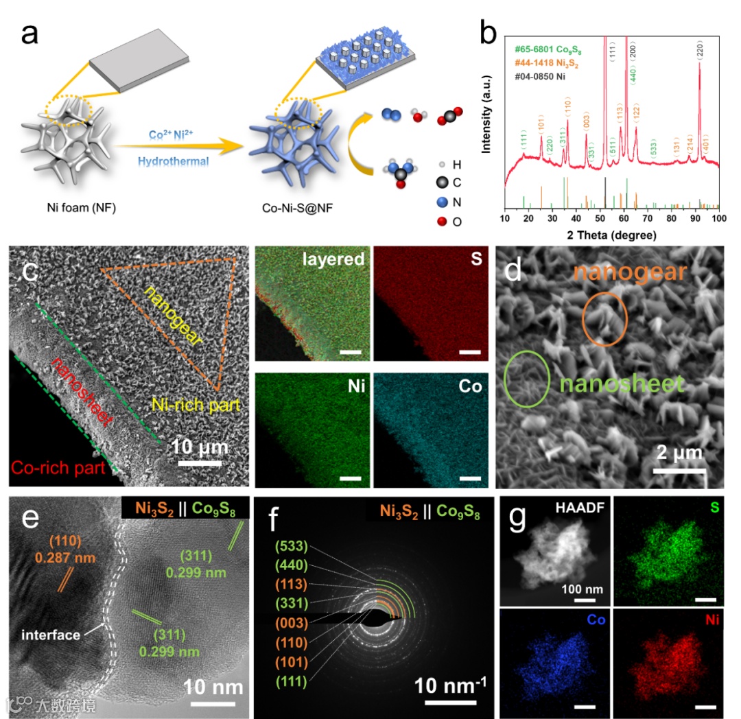 传统的过渡金属硫化物异质结构催化剂通常使用两步法来进行异质结构的构建,这需要复杂的合成步骤。此外,两相之间的界面结合力较差,改善性能效果不明显。本文采用EDTA作为表面活性剂,加入金属前驱体盐和硫源(TU)一步水热,在泡沫镍表面生长出具有丰富异质界面的复合材料(称为Co-Ni-S@NF),其由纳米片状的Co9S8和纳米齿轮状的Ni3S2组成,并通过DFT计算验证了异质界面处具有充分的电荷转移。
