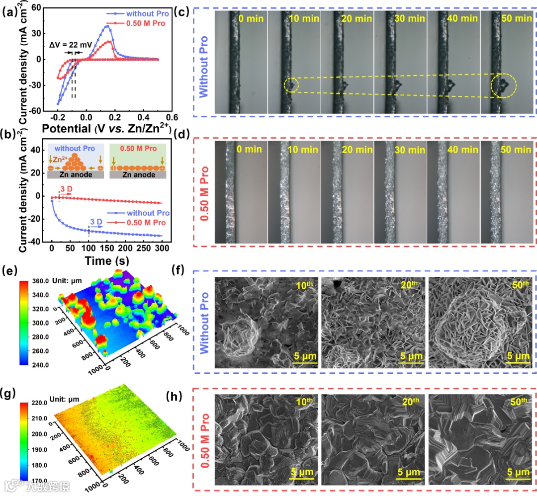 使用循环伏安法和计时电流法分别研究了Zn2+在负极表面的成核和扩散行为,发现脯氨酸的引入有助于增大Zn2+的成核过电位,从而增大Zn2+成核概率,减小Zn2+临界成核半径,并有助于缓解Zn2+在负极表面向尖端位置2D扩散,进而有助于抑制枝晶的生成。原位光学显微和3D激光共聚焦显微表征证实了这一点。扫描电镜表征进一步证实脯氨酸的引入使锌的微观沉积形貌致密均匀,不易生成枝晶。