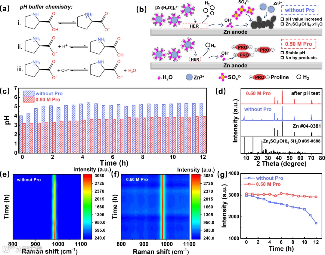 12小时的pH监测实验证实,纯ZnSO4电解液的pH随循环的进行出现显著上升,实验结束后的电极表面XRD谱图出现归属于Zn4SO4(OH)6·5H2O的特征衍射峰,证实副产物的生成。而含有脯氨酸的电解液的pH在整个实验过程保持稳定,结束后的电极表面仅存在Zn的衍射峰,表明未发生明显副反应。通过拉曼光谱监测实验过程中v(SO42−)的强度变化,以反映电解液中的SO42−浓度变化,可以发现在纯ZnSO4电解液中,v(SO42−)的强度在实验过程中逐渐降低,反映其参与副反应而逐渐被消耗的过程;在含有脯氨酸的电解液中v(SO42−)的强度保持稳定,表明未发生明显副反应。上述实验证实pH缓冲效应在抑制副反应发生中的关键作用。