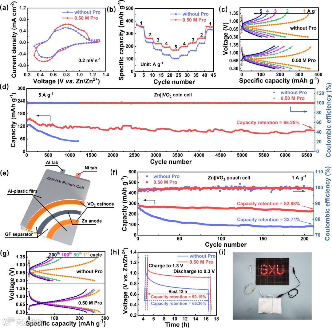 组装Zn||VO2扣式电池对脯氨酸电解液添加剂的实用性进行了验证。发现脯氨酸的引入显著提升了全电池的倍率性能和长循环容量保持率。为模拟工业应用场景,组装Zn||VO2软包电池进行测试,发现脯氨酸的引入可以提升软包电池在工作和静置状态下的容量保持率,由两个软包电池串联可以点亮48个LED灯。