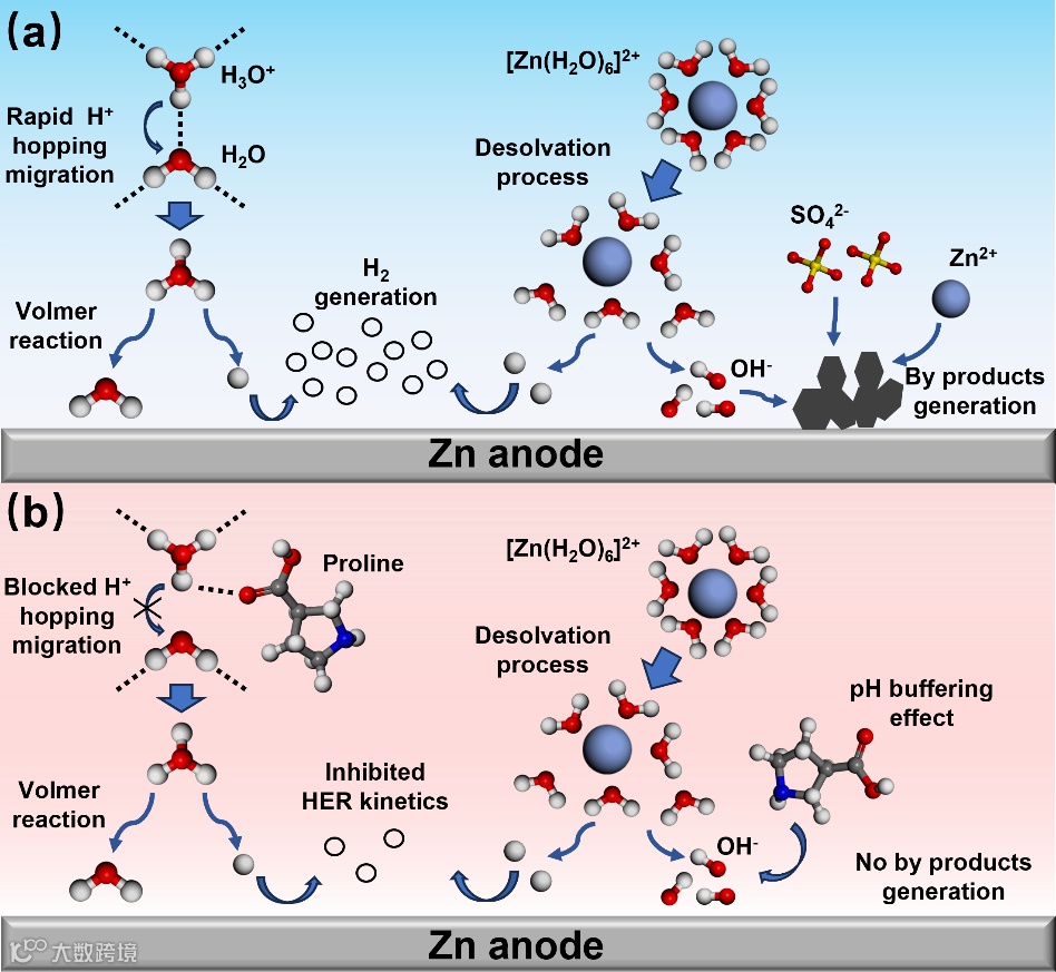 图1.(a)弱酸性电解液中水致副反应的机理;(b)脯氨酸主导的氢键网络重构和pH缓冲效应抑制水致副反应示意图。