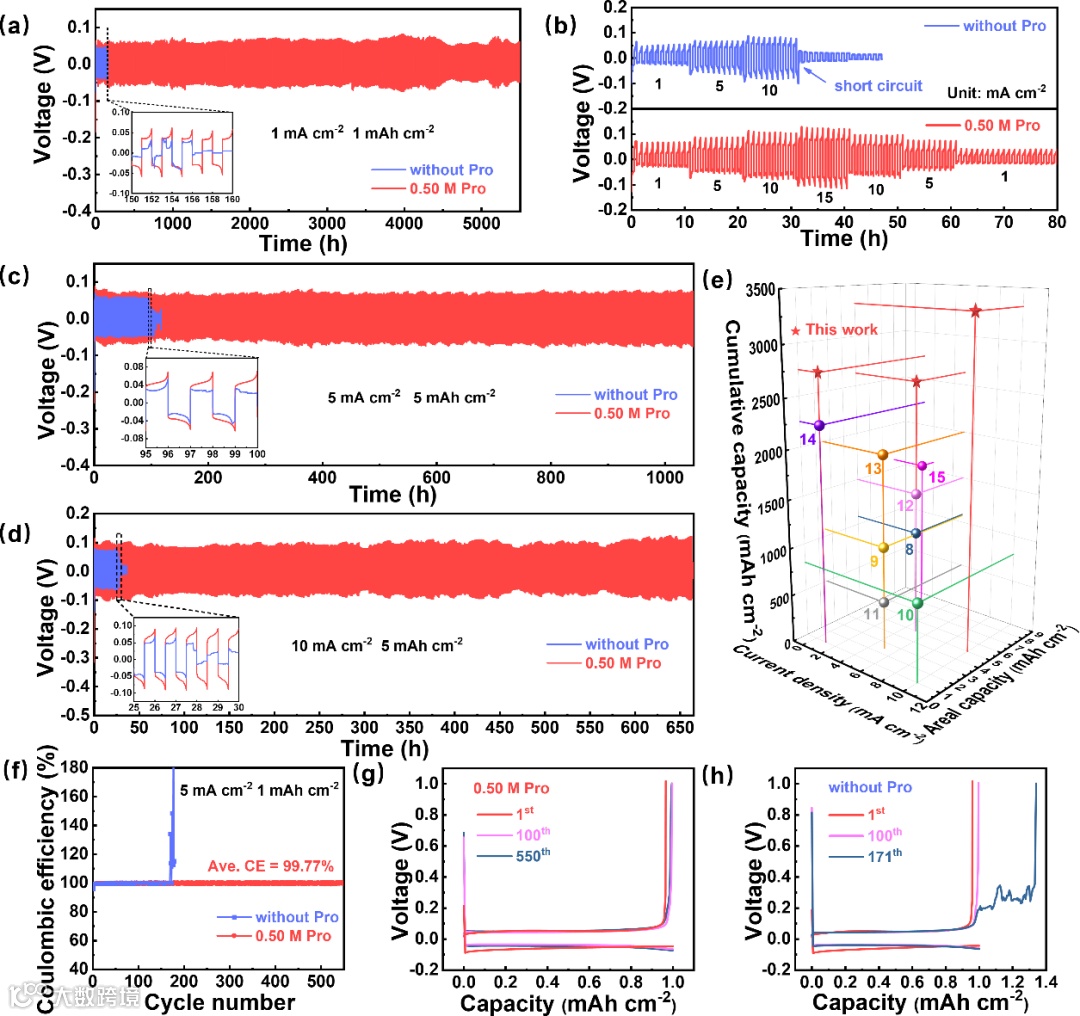 得益于脯氨酸对水致副反应和枝晶生长的抑制作用,锌负极电化学性能取得显著提升。Zn||Zn对称电池在1.0 mA cm−2,1.0 mAh cm−2的条件下能够稳定循环5500 h,在5.0 mA cm−2,5.0 mAh cm−2以及10 mA cm−2,5.0 mAh cm−2的严苛工作条件下也可以达到1060 h和660 h,显著高于使用纯ZnSO4电解液的对称电池。将上述性能换算成累计电镀容量后与近期同类型文献进行对比,凸显出本工作的锌负极性能具有较强竞争力。此外,库仑效率测试表明,脯氨酸的引入使Zn||Cu半电池能够稳定运行超过550个循环,平均库仑效率为99.77%。上述性能测试表明脯氨酸的引入显著提升了Zn负极的可逆性。