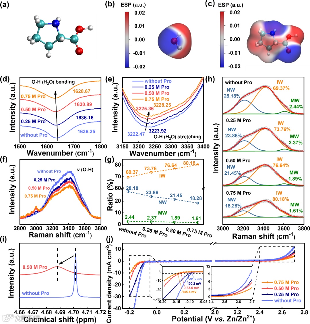 核磁共振氢谱结果表明,H2O的1H信号表现出明显的高场位移(从4.702变化到4.687),这表明1H周围电子密度的增加,以及由脯氨酸的给电子基团和H2O之间的氢键相互作用引起的屏蔽效应增强,进一步佐证了由脯氨酸主导的氢键网络重构。H2O分子之间氢键网络的削弱使质子更难通过Grotthuss机制转移到电极表面进行还原反应,从而降低HER动力学。线性扫描伏安法结果证实,随着脯氨酸浓度增加,HER的起始电位从−91.2 mV延后至−145.4 mV(vs. Zn/Zn2+)。同时,含有脯氨酸的电解液也显示出延后的OER起始电位和下降的动力学,证实了脯氨酸主导的氢键网络重构在抑制水分解并获得更宽的电化学稳定窗口方面的积极作用。