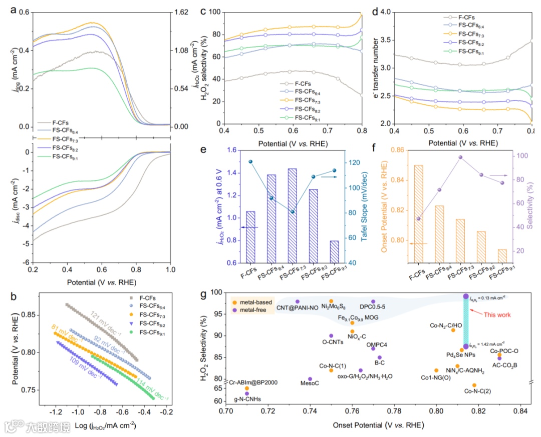 图 2. F/S掺杂的碳纳米纤维2e− ORR催化性能评价