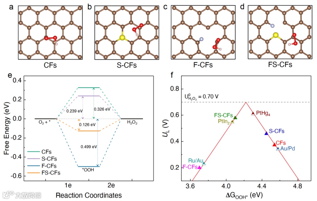 作者以石墨烯结构为基底,构建了四种不同F/S掺杂情况的F/S-CFs计算模型。通过计算∗OOH中间体与活性位点的吸附能,对比了不同掺杂模型上二电子氧还原途径的热力学计算结果。该结果证明FS-CFs计算模型展现出最低的过电势(0.126 V),在UL与∆G∗OOH火山图中,FS-CFs最接近火山顶点,热力学性能与之前报道的一些贵金属基催化剂性能可比。
