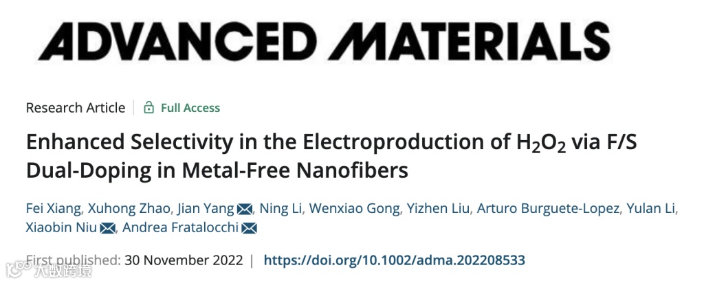 Fei Xiang, et al, Enhanced selectivity in the electroproduction of H2O2 via F/S dual-doping in metal-free nanofibers, Advanced Materials. 2022