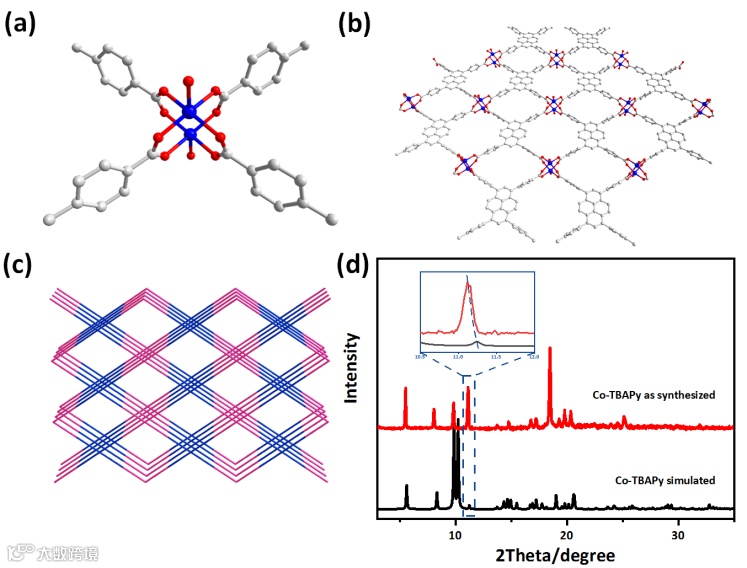 Figure 1. Crystal structure of Co-TBAPy. (a) Coordination environment of Co2+, (b) 2D layer structure of Co-TBAPy along the a-axis, (c) Simplified diagram for the packing of 2D layers with (4, 4)-net topology, (d) PXRD patterns of Co-TBAPy as synthesized and simulated. Color representation: gray, C; red, O; blue, Co. H atoms are removed for clarity.