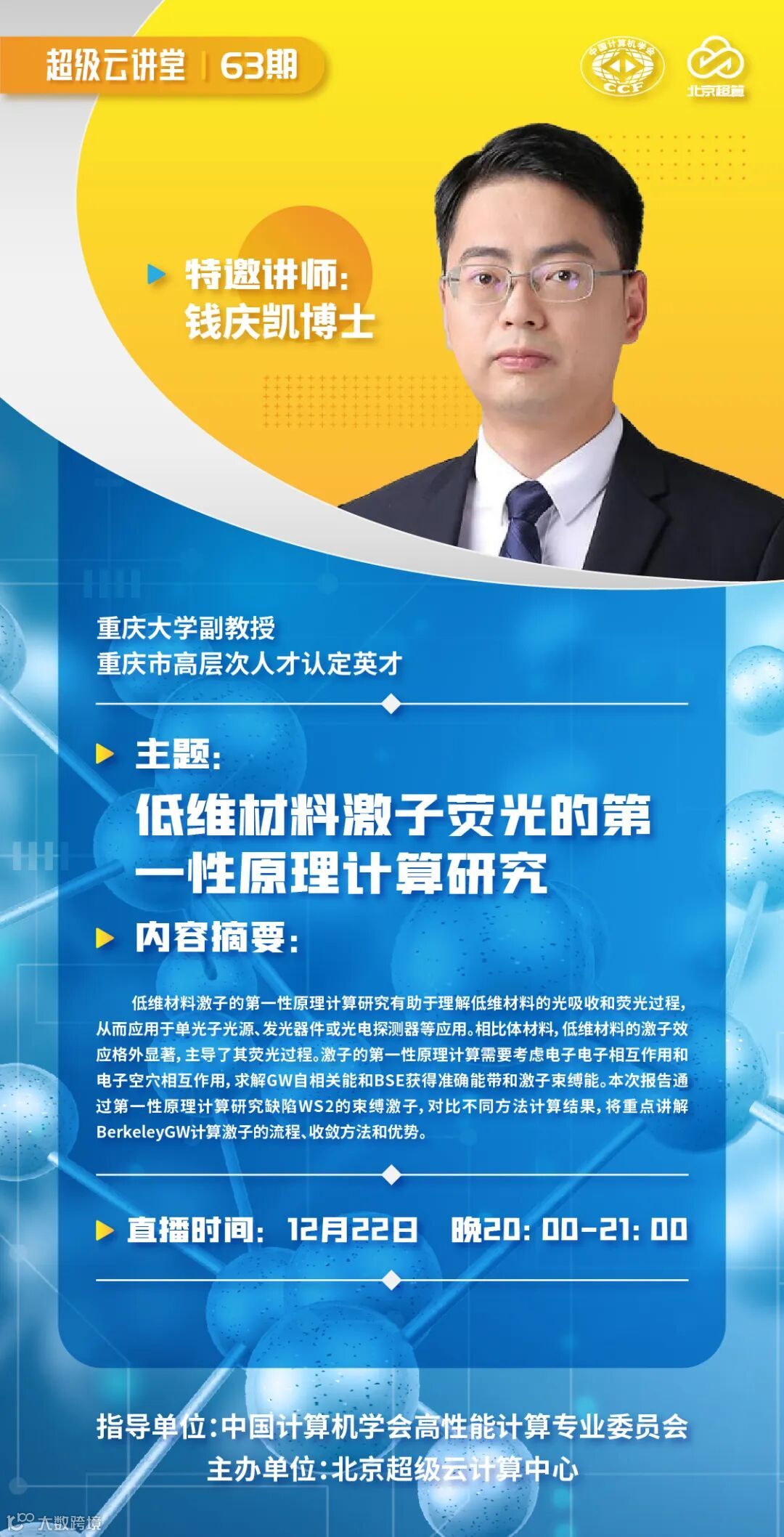 「超级云讲堂」由中国计算机学会高性能计算专业委员会指导,北京超级云计算中心主办,是集科研、学术、教育为一体的在线科普、公益直播讲堂。邀请各领域技术大咖、知名学者解读最新、最热科研、科普话题,分享基于云上科研环境的应用经验与成功实践。致力于打造一个易参与、乐分享、勤思考、善实践的科研、科普、学术交流平台,搭建科研、教研工作者与公众的纽带和桥梁,不但注重科学思想的传播,更注重不同领域思想的交叉和碰撞,志在营造多元的、思辨的科学文化交流氛围。