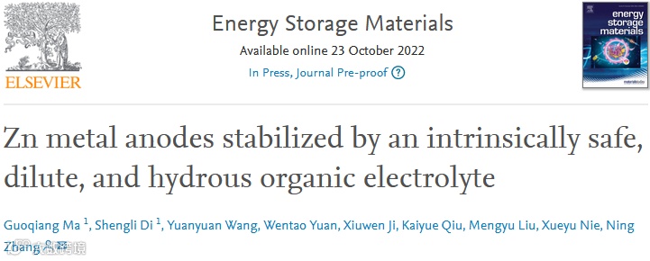 Guoqiang Ma, Shengli Di, Yuanyuan Wang, Wentao Yuan, Xiuwen Ji, Kaiyue Qiu, Mengyu Liu, Xueyu Nie, Ning Zhang*, Zn metal anodes stabilized by an intrinsically safe, dilute, and hydrous organic electrolyte, Energy Storage Materials