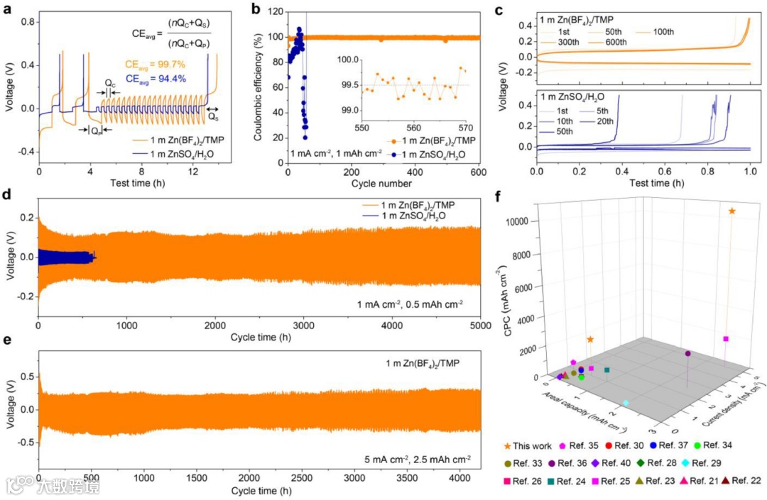 (a)Zn//Cu电池在不同电解液中的平均库伦效率测试。在1 mA cm-2,1 mAh cm-2条件下(b)Zn//Cu电池的循环稳定性和(c)对应的充放电曲线。Zn//Zn电池在不同电解液中在(d)1 mA cm−2,0.5 mAh cm−2和(e)5 mA cm−2,2.5 mAh cm−2条件下的长循环性能。(f)本工作与已报道的RZBs电解液进行比较。