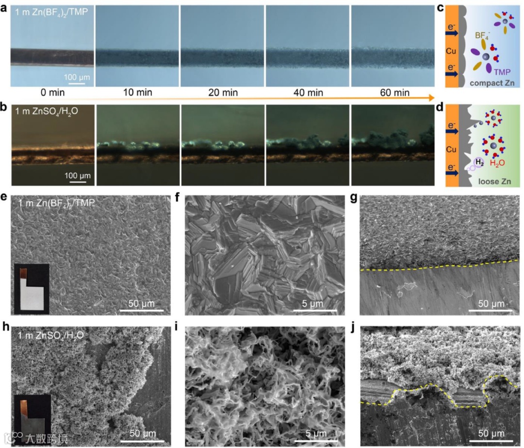 (a)1 m Zn(BF4)2/TMP和(b)1 m ZnSO4/H2O在5mA cm−2下的原位光学锌沉积行为照片。(c)Zn(BF4)2/TMP和(d)ZnSO4/H2O中的Zn沉积示意图。(e-g)1 m Zn(BF4)2TMP和(h-j)1 m ZnSO4/H2O中沉积锌(5 mAh cm-2)的SEM图像和光学照片(插图)。