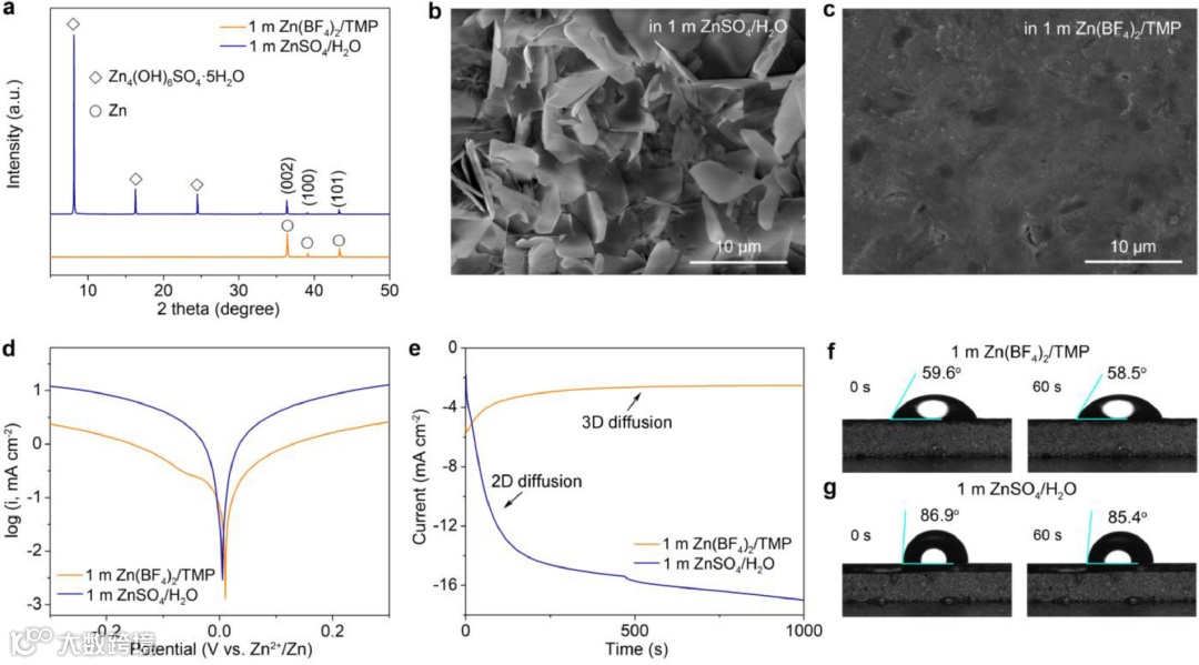 (a)浸泡在不同电解液中Zn电极的XRD图谱。(b)浸泡在1 m ZnSO4/H2O和(c)1 m Zn(BF4)2/TMP中的Zn电极的SEM图片。(d)Tafel曲线和(e)不同电解液中锌电沉积的计时电流曲线。(f)1 m Zn(BF4)2/TMP和(g)1 m ZnSO4/H2O电解液在Zn电极上的接触角。