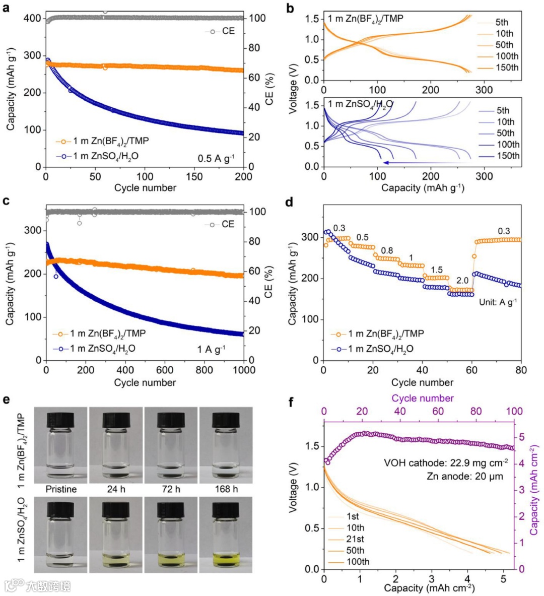 (a)Zn//VOH电池在0.5 A g−1下的循环性能及对应的(b)1 m Zn(BF4)2/TMP和1 m ZnSO4/H2O电解液的充放电曲线。(c)1 A g−1下的长循环性能和(d)Zn//VOH电池的倍率性能。(e)VOH正极在1 m Zn(BF4)2/TMP和1 m ZnSO4/H2O中浸泡不同时间的光学图像。(f)大负载量下Zn//VOH的循环性能及其放电曲线。