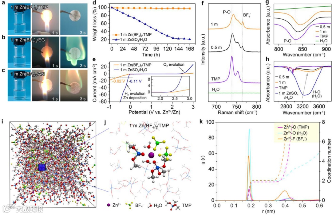 (a-c)将1 m Zn(BF4)2溶于(a)TMP、(b)EG和(c)AN溶剂中组成的不同电解液照片及对应的点火照片。(d)室温下的挥发性测试和(e)在1 mV s-1下,1 m Zn(BF4)2/TMP和1 m ZnSO4/H2O电解液的电化学窗口。不同浓度的Zn(BF4)2/TMP电解液的(f)拉曼光谱和(g,h)红外光谱。(i)MD模拟的快照和(j)1 m Zn(BF4)2/TMP的典型Zn2+溶剂化结构。(k)1 m Zn(BF4)2/TMP中Zn2+-O(H2O)、Zn2+-O(TMP)和Zn2+-F(BF4-)的RDF图及相应的配位数。