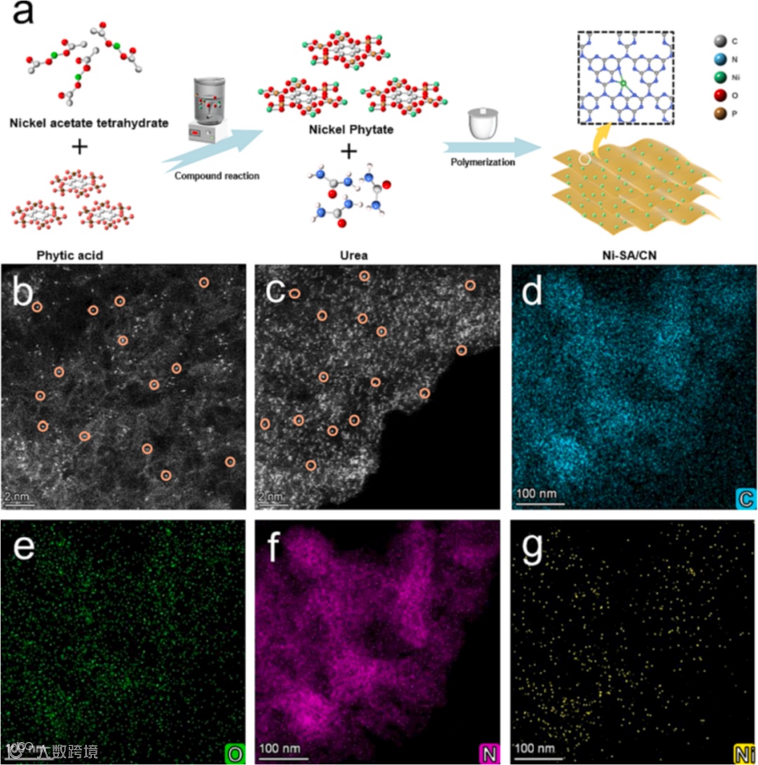 Ni-SA/CN催化剂的过程主要包括两个步骤:Ni2+-PA配合物(植酸镍)的合成及其与氮化碳前驱体(尿素)共聚合。具体而言,乙酸镍和植酸分子经简单络合反应生成植酸镍。随后将获得的植酸镍与尿素混合,在550 °C下共煅烧获得最终产物。通过植酸分子的引入实现了单原子镍负载量从0.07到5.68 wt.%的调控。
