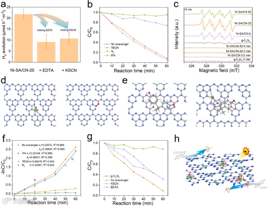 文章通过观察光催化水分解过程中毒化剂KSCN或EDTA加入前后产氢速率的变化揭露出光生电子主要的集聚区域为Ni-N4。同时本文揭示了镍单原子催化剂在光催化双酚 A(BPA)降解过程中 ·O2- 生成和h+ 参与氧化的活性位点。