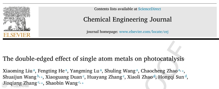 中国石油大学(华东)赵朝成教授、江苏大学王帅军博士和澳大利亚阿德莱德大学张金强博士/王少彬教授合作,在国际知名期刊Chemical Engineering Journal上发表了题为“The double-edged effect of single atom metals on photocatalysis”的研究论文。这项工作揭示了单原子催化剂结构与光催化反应活性之间的内在关系,并为单原子光催化提供了新的见解。